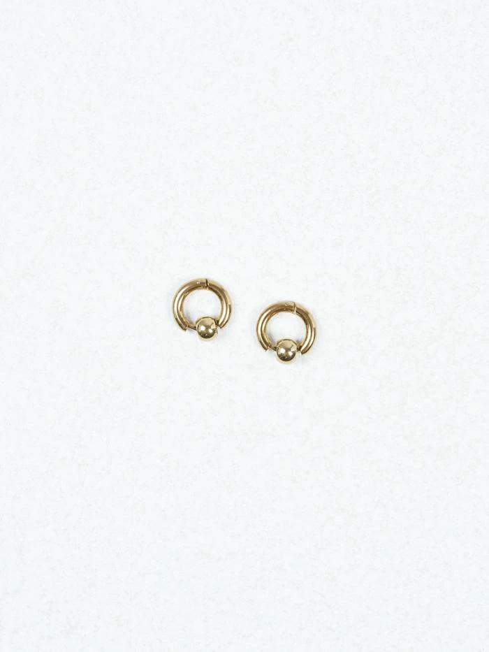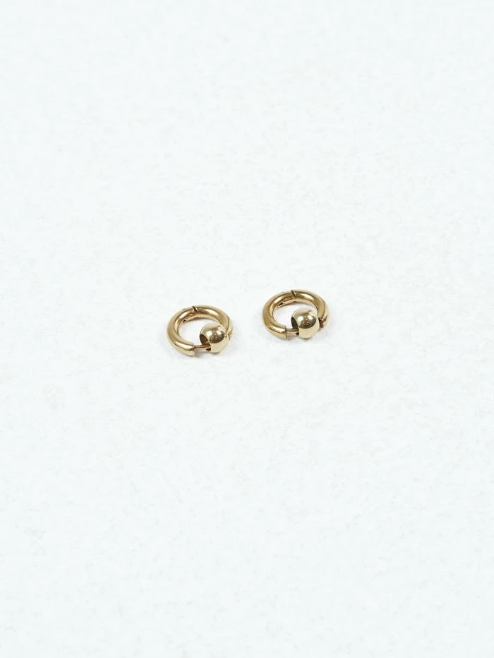 The Courtney Hoops by Margaux Lee are simple yet edgy hoops to adorn your ears day in and out. The hoops feature a removable ball and a secure click and close hinge. Pair with other jewellery pieces to complete your look.Â