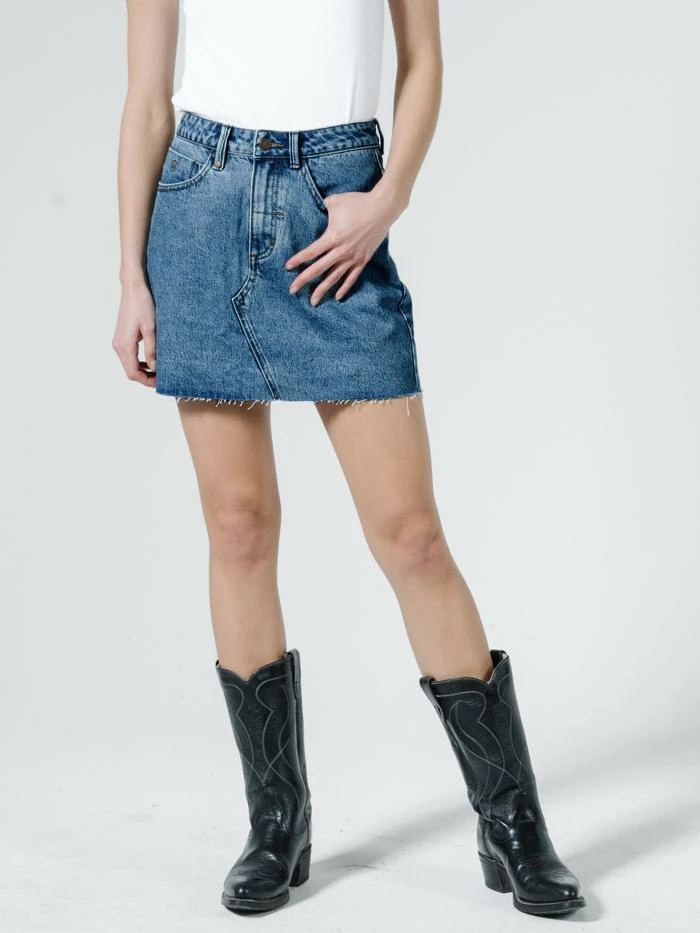 A classic longer line A-line skirt in our new Rinsed Blue Denim wash. The Leni Skirt is high-waisted, with a mid-thigh length and a raw hem.