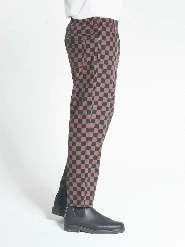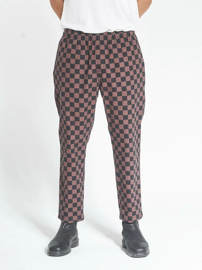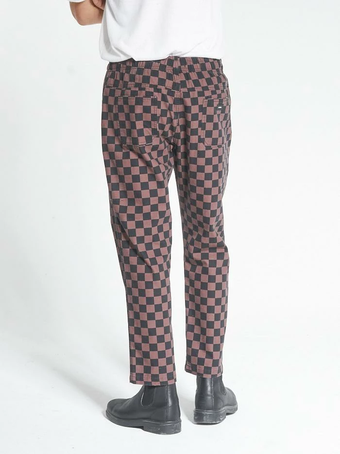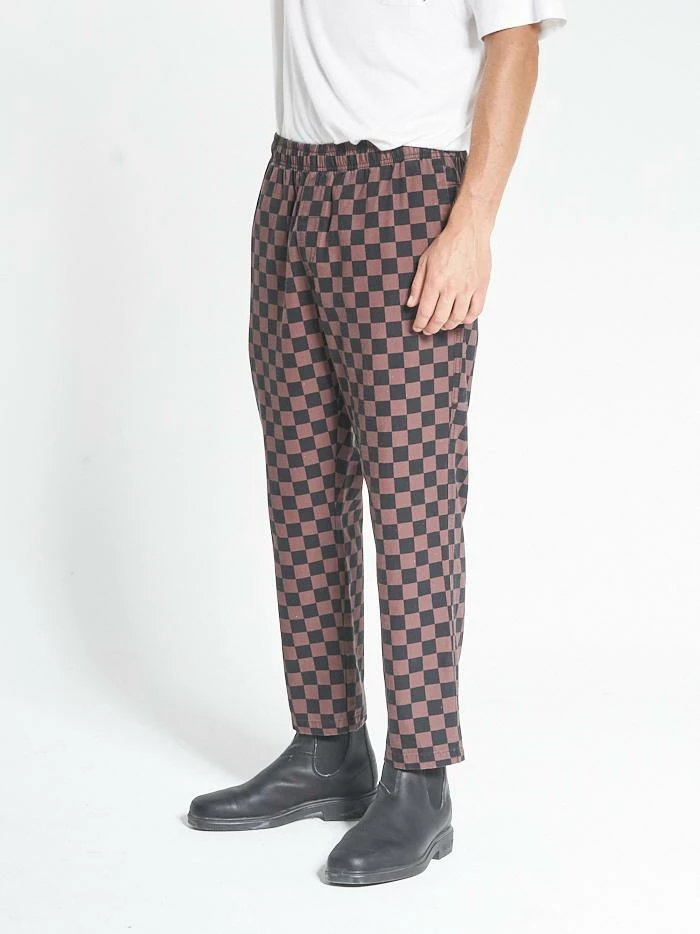 The Aalto series is our take on the beloved checkerboard pattern across multiple fabrications. The Aalto pattern comes in our bestselling chopped surf pant featuring soft tobacco and black hues. These pants will make any outfit a fun time.Â