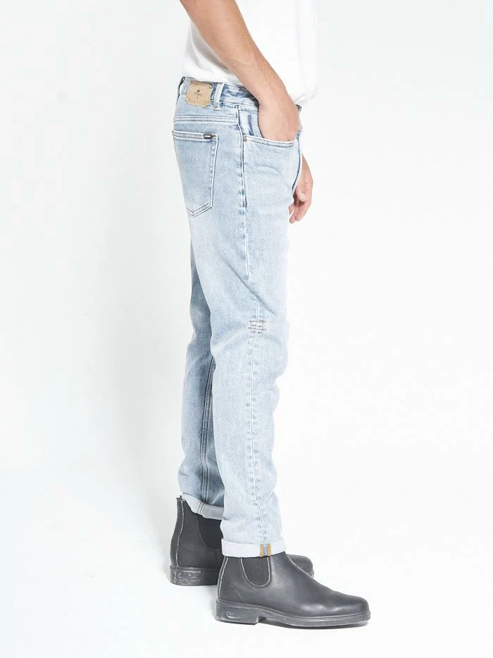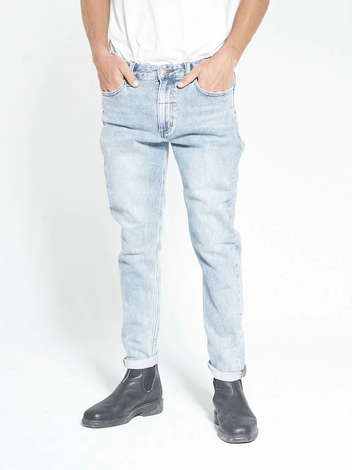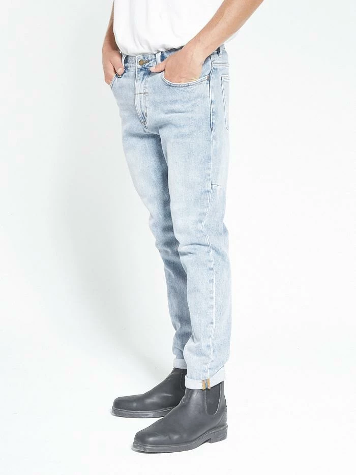 Our standard fit jean in our new Aged Blue colourway. A relaxed waist and thigh with a gradual tapered leg down to the leg opening make this a true slim, slouch fit jean. The Buzzcut gives you a little more room around the waist while still keeping a slim jeans look.