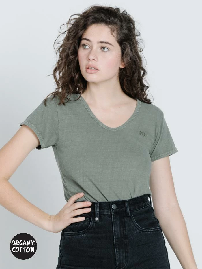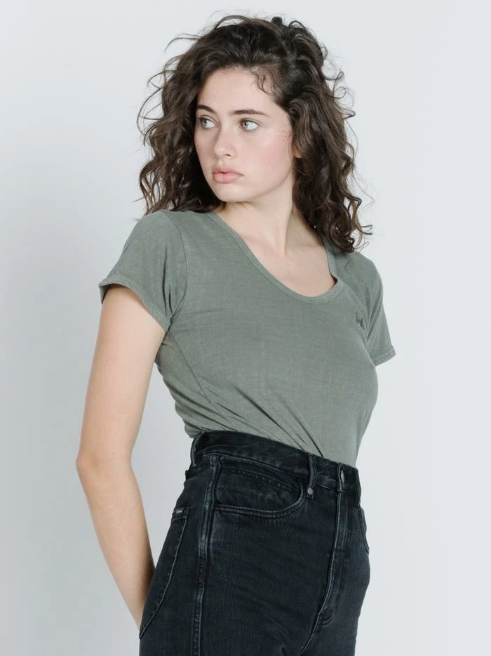 When you stumble across a damn good tee, you just have to commit. It is one of those things that when you are looking for it you can never find it, so when it presents itself right in front of you, it is a no brainer. This tee is made of an organic cotton and linen blend making it soft and relaxed. It is a great colour and nice feminine shape that will work well with prints or denim.
