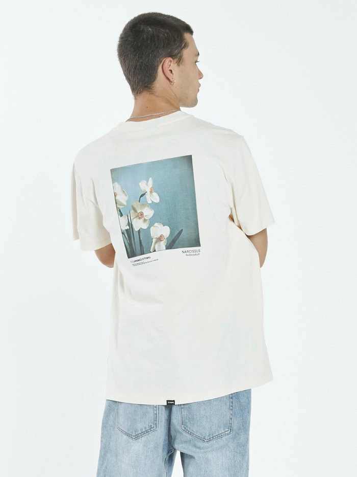 With a welcome photographic print direction comes this season’s must have floral photo print. Small subtle branding on front of the tee with a beautiful haunting floral image on the back, the Narcissus tee will remain an all-time favourite.