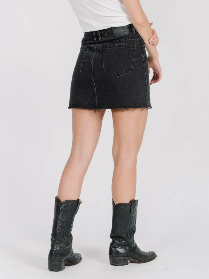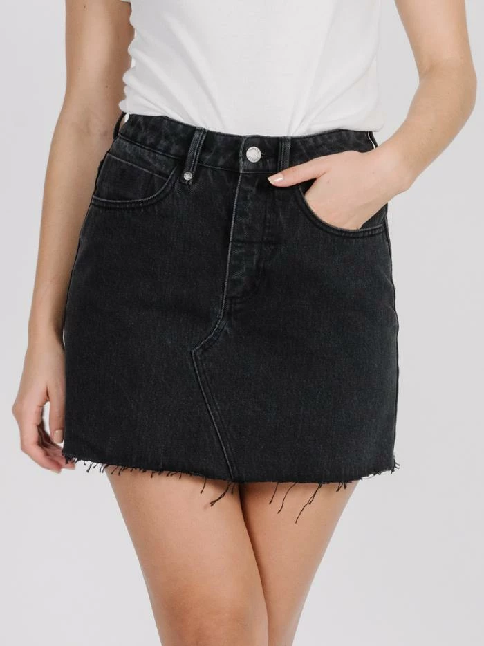 A classic longer line A-line skirt in our Faded Black Denim wash. The Leni Skirt is high-waisted, with a mid-thigh length and a raw hem.