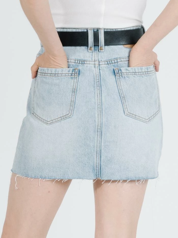 The Leni skirt is a classic longer line A-line skirt in our new Time Worn Blue colourway, now available in 100% Organic Cotton. The Leni Skirt is high-waisted, with a mid-thigh length and a raw hem.