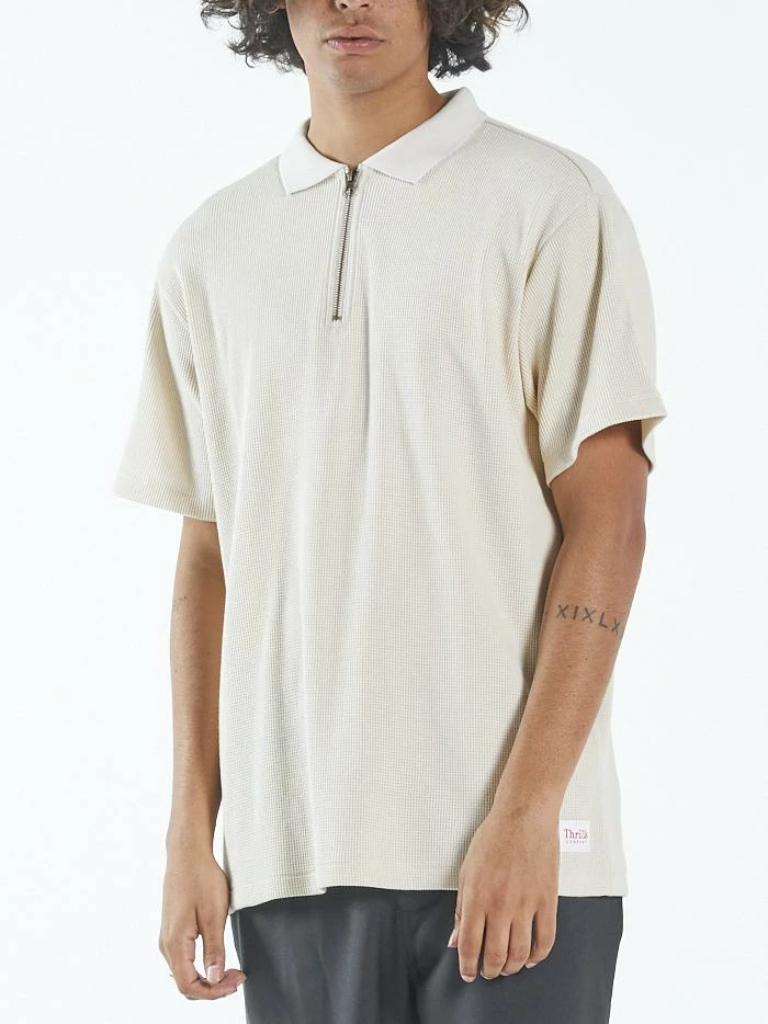The Waffle 3 Quarter Zip Polo is part of our exclusive “Waffle” capsule collection, where each piece has been carefully created using our new, unique and high-quality waffle fabric, made in our adorned organic cotton. In line with our Unbleached initiative, this style features our premium unbleached and undyed fabric. Comprising of 14 comfort-driven styles, this capsule nods to elevated loungewear while staying true to our iconic vintage-inspired street feel, all with sustainability front of mind. Available exclusively at Thrills stores and online only.