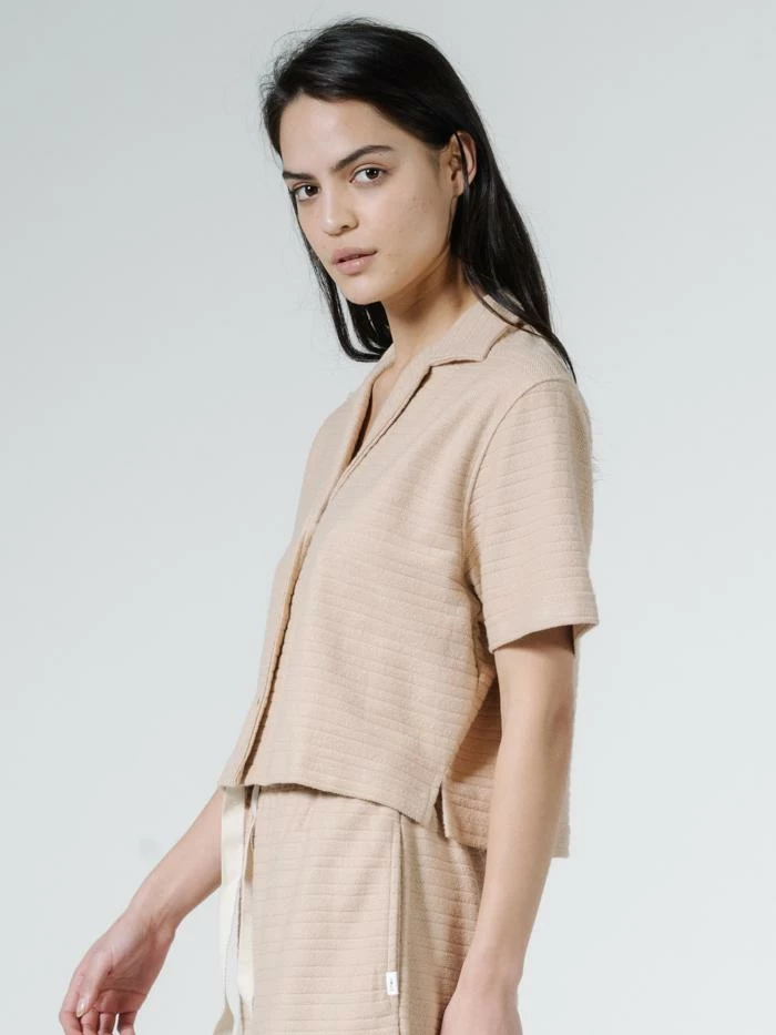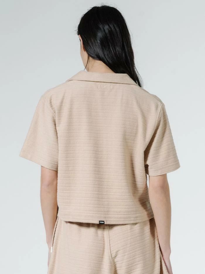 This shirt will be an easy go to for everything from summer beach days to lazy couch sessions in Autumn. Timeless and made out of soft Terry Towelling, it looks great with denim or a print to spice it up, or create the dream set with our Terry Field Shorts. Comfort and style all in one.